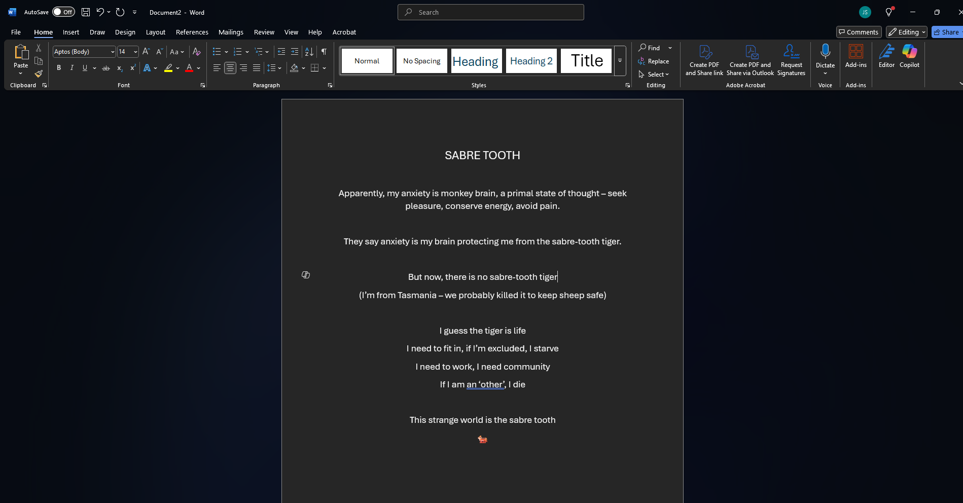 “It’s an entry in my art journal (that I wrote up in word cause of handwriting) I thought sounded artsy, but maybe it’s just edgy? I’m 33 I’m too old for this stuff (but the right generation – millennial pride!)”